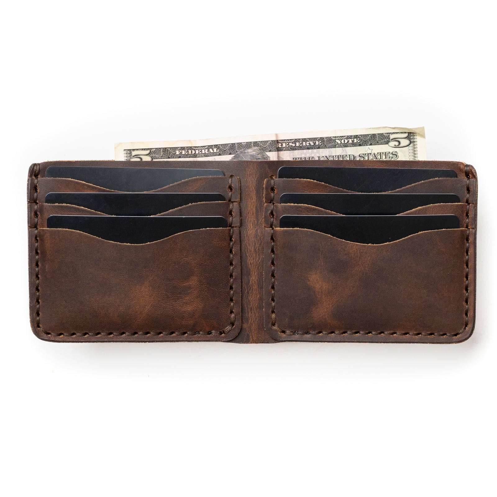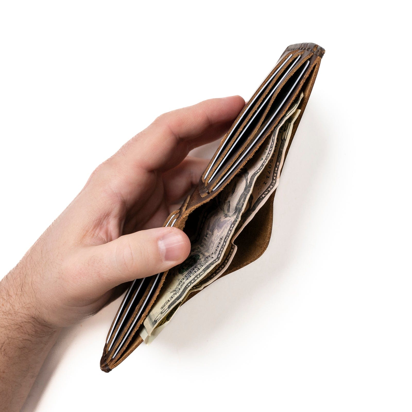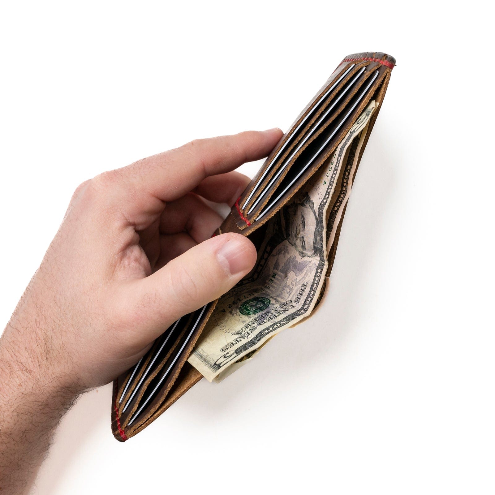Full-grain leather means your wallet will develop character and patina. We hand-sew this wallet with thick Tiger Thread for decades of use. We also burnish and polish the wallet edges which adds refinement to the finished piece. The wallet features a convenient billfold for quick access to your cash. Our minimalist design allows you to carry all your essential cards and cash without the bulk. We take a lot of pride in our work and back each wallet with a lifetime guarantee.